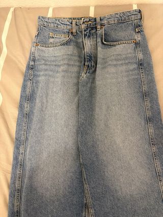 Falda vaquera de corte largo. - Diseño de mezclilla. - Abertura frontal.