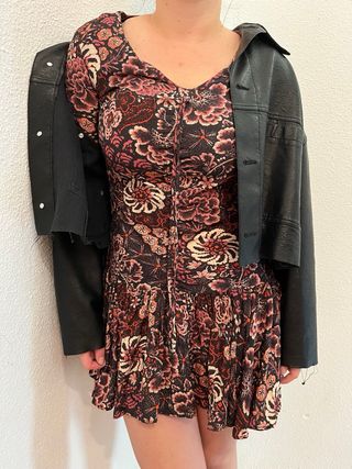 Vestido corto con estampado floral sobre fondo negro. Diseño con cuello camisero y manga larga. - Estampado de flores pequeñas. - Corte escalonado en la falda. - Cierre de botones en la parte delantera.