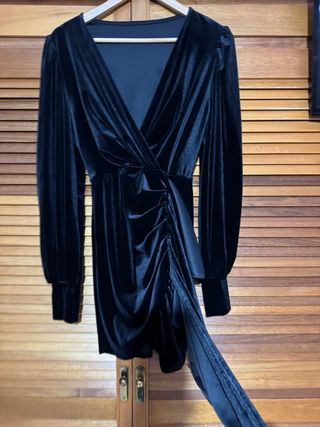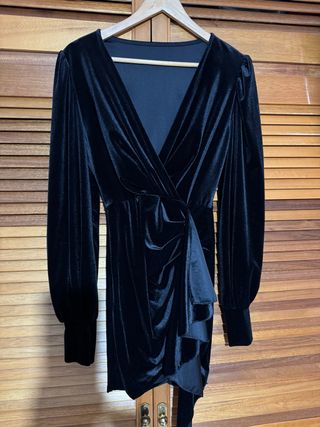 Elegante vestido de terciopelo con un diseño cruzado y drapeado. - Tejido de terciopelo suave. - Mangas largas abullonadas. - Detalle de volante en la falda. - Corte cruzado en la parte delantera.