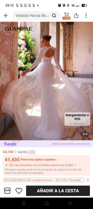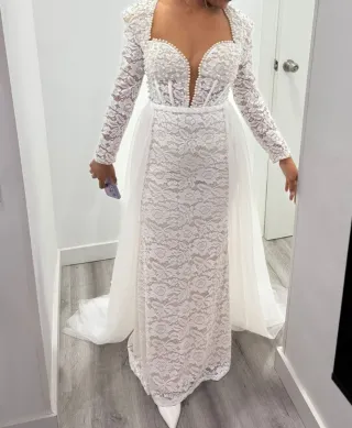 Elegante vestido de novia con detalles de encaje y manga larga. Un diseño delicado y romántico. - Cuerpo de encaje con escote en la espalda. - Mangas largas de encaje. - Falda vaporosa de tul.
