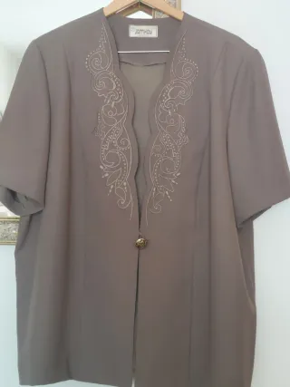 Elegante conjunto de falda y chaqueta. - Chaqueta con manga corta y detalles bordados. - Cierre de botón joya en la parte frontal de la chaqueta. - Falda de corte recto. _ Falda con forro: 90cm cintura con elastico; 66cm largo, con al menos 3cm para bajar _ Chaqueta: 75cm largo