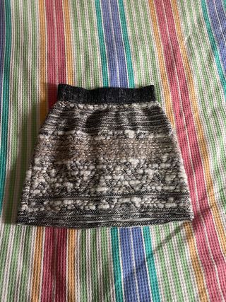 Falda corta con un diseño tejido y texturizado. La cintura es elástica y de acabado brillante. Tejido con hilos de diferentes colores y texturas.