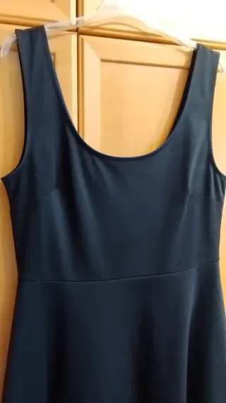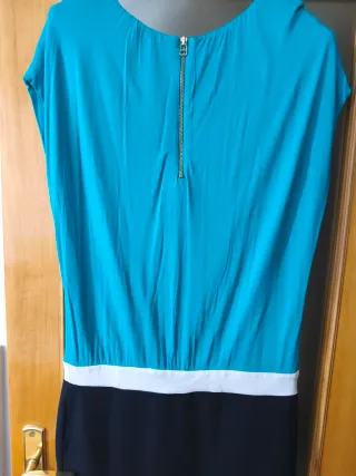 Vestido de Mango con un diseño moderno y elegante. - Parte superior azul con cremallera trasera. - Banda blanca en la cintura. - Falda inferior negra.