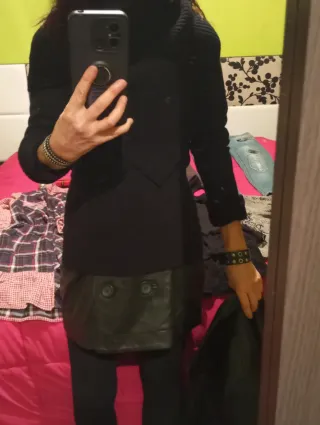 Talla S - Color negro liso - Tejido: punto acanalado elástico y ajustado al cuerpo - Corte: cropped (largo corto, por encima de la cintura). Mangas largas y ceñidas. Escote pronunciado en V, con solapa tipo cuello amplio que recuerda a un mini blazer o polo abierto. Estilo elegante–minimalista con un toque moderno; puede ser casual chic o nocturno. Ajuste entallado, pensado para marcar la silueta. Uso ideal: combina bien con pantalones de tiro alto, faldas, jeans o looks más formales con blazer.