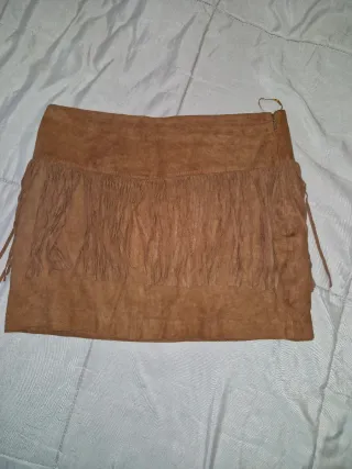 Falda corta de gamuza con un diseño de flecos. - Material: Gamuza. - Detalle: Flecos largos en la parte delantera y laterales. - Cierre: Cordón dorado en la cintura.
