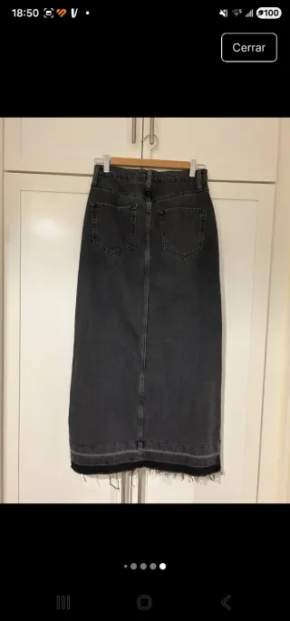 Falda vaquera larga con un diseño moderno. - Bajo deshilachado. Falda vaquera larga con abertura trasera. Tejido de algodón estilo tejano vaquero. Diseño recto. Diseño largo. Tiro medio. Trabillas. Costuras decorativas. Detalle de abertura en la parte posterior. Cierre de cremallera y botón. Talla L. Es grande. Materiales: 100% algodón. Color azul. Marca Mango.