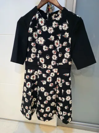 Vestido negro de Zara con un bonito bordado floral en la parte delantera y mangas largas. - Diseño con estampado de puntos en las mangas y el bajo. - Corte holgado y falda con vuelo.
