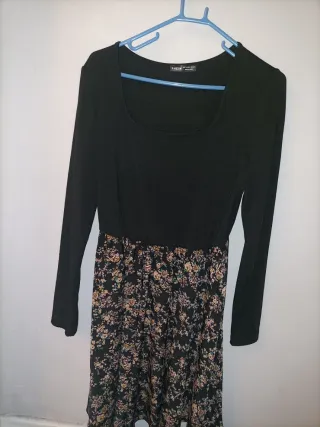 Vestido de manga larga con estampado floral. - Cuerpo superior negro liso. - Falda con estampado de flores pequeñas en tonos tierra y verde.