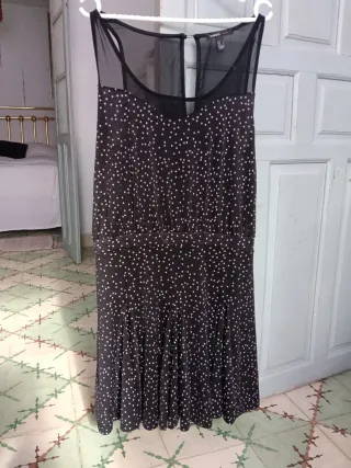 Vestido negro con estampado de lunares blancos. Presenta un diseño con escote de malla transparente. - Mangas cortas. - Falda con vuelo.