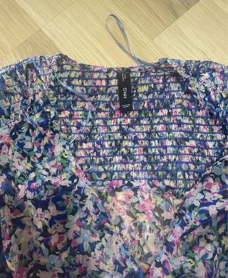Vestido de la marca Mango con estampado floral. Es una prenda nueva. - Diseño con escote cruzado. - Mangas largas abullonadas. - Cintura elástica fruncida. - Falda con volantes.