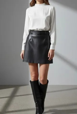 Conjunto vintage de piel en tonos beige y marrón, compuesto por una camisa y una falda. - Camisa de manga larga con cuello. - Bolsillo en el pecho. - Cierre de botones. - Falda a juego.