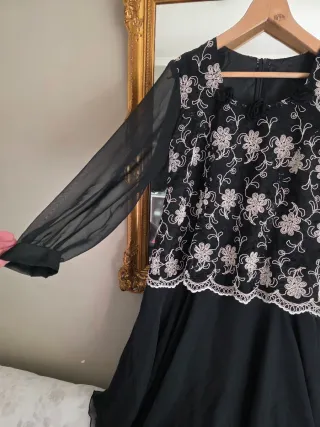 Elegante vestido largo negro de tul, Mangas largas transparentes y falda con varias capas de tul Cuerpo superior con bordado floral blanco roto que le da un aire sofisticado y elegante. Cierre de cremallera invisible en la espalda. Precio compra 595€