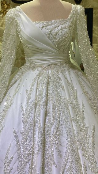 Elegante vestido de novia blanco, con un diseño único y detalles de pedrería. - Mangas largas adornadas con pedrería. - Escote drapeado. - Falda voluminosa con aplicaciones de pedrería.