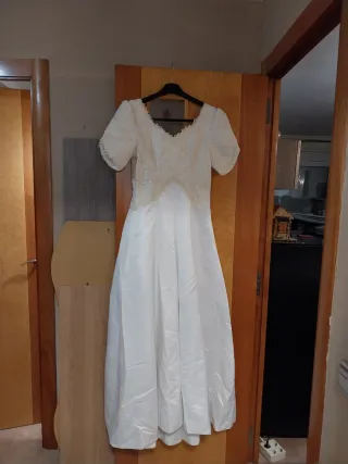 Elegante vestido de novia con un diseño espectacular con cola de volantes y cancán. Antiguo y clásico pero en buen estado. - Cuerpo de encaje con detalles. - Mangas abullonadas. - Falda con volantes y una larga cola. - Cierre con cordones en la espalda. Se debe llevar a la lavandería para una puesta a punto. Precio: 200 euros negociables. Se regala el vestido rojo (imágenes) para dama de honor de talla 42-44. Sin uso.