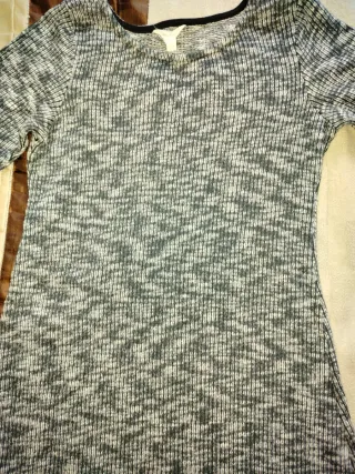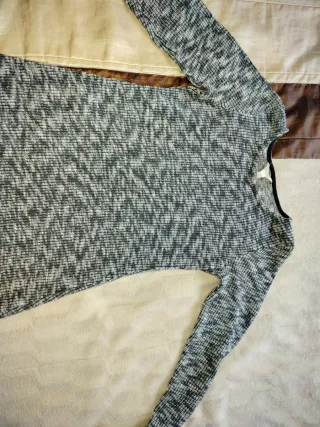 Jersey de punto en color negro con rayas finas blancas horizontales, un clásico fácil de combinar y siempre actual Diseño de cuello en pico, manga larga y corte recto, cómodo y favorecedor 📐Talla M equivalente a una 42 Tejido de punto ligero, suave y cómodo ✨ Ideal para entretiempo o para llevar debajo de una chaqueta en invierno Estilo casual y versátil: queda genial con vaqueros, pantalón negro o falda En muy buen estado, apenas se ha usado. Bien cuidado y listo para una segunda vida ♻️