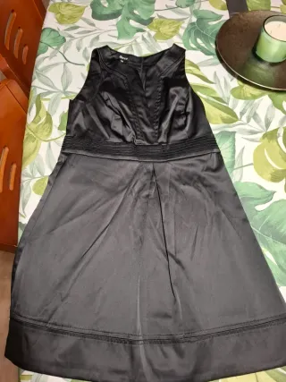 Elegante vestido negro de la marca Blanco. Ideal para cualquier ocasión. - Diseño sin mangas. - Tejido satinado. - Cintura marcada con detalle. - Falda con pliegues.