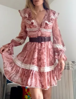 Vestido de Mango con un diseño romántico y femenino. Estilo zimmermann - Estampado floral en tonos rosas y blancos. - Volantes y detalles de encaje en mangas y falda. - Cinturón a juego.