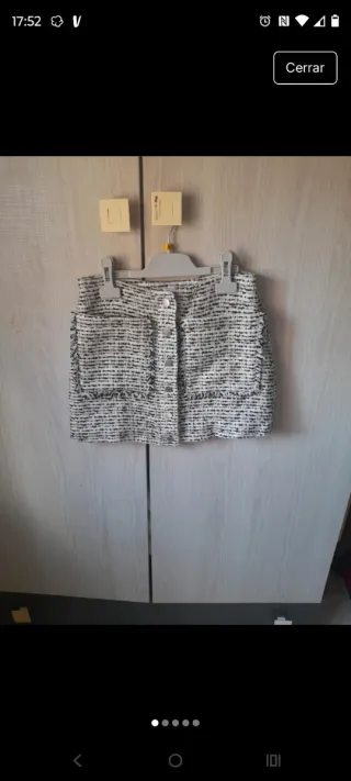 Minifalda de tejido tweed con un diseño moderno y elegante. - Cierre de botones en la parte delantera. - Bolsillos decorativos con detalle de flecos. - Tejido con mezcla de hilos blancos y negros.