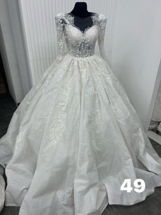 Elegante vestido de novia de corte princesa, con manga larga y escote ilusión. - Cuerpo del vestido con pedrería y encaje. - Falda voluminosa con detalles de pedrería y brillo. - Mangas largas transparentes con detalles. - Escote ilusión con aplicaciones de encaje.