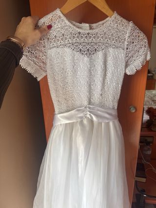 Usado solo una hora durante la misa Vestido de comunión para niña de la marca Mango. Un diseño elegante y delicado. - Cuerpo con detalles fruncidos. - Cinturón de tela a juego. - Falda con varias capas de tul. - Mangas abullonadas con volantes.