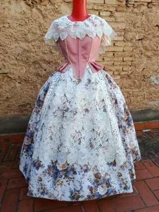 Traje de fallera tradicional con detalles en encaje negro. - Cuerpo y falda con estampado floral. - Cuello y mangas con encaje blanco. - Broche decorativo en el pecho.