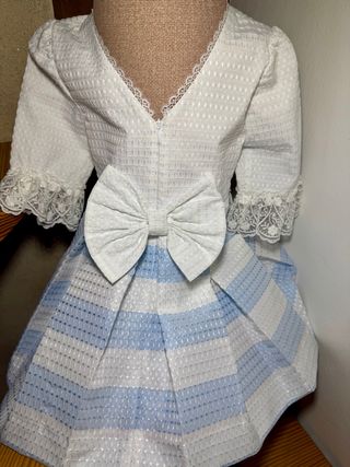 Vestido de niña de la marca Miranda, ideal para celebraciones. Presenta un diseño elegante con detalles de encaje. PRECIO NO NEGOCIABLE - Cuerpo blanco con textura. - Falda a rayas celestes y blancas. - Lazos decorativos en la parte delantera. - Mangas cortas con detalle de encaje.