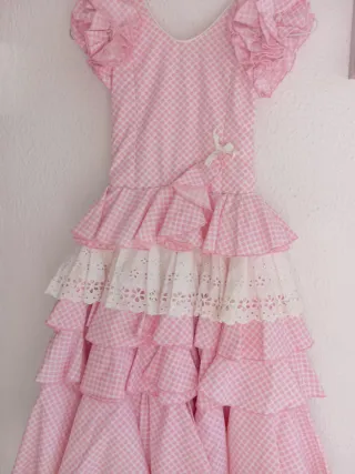 Precioso traje de flamenca para niña, talla 2 años pero da para mucho más, de Artesanía Mari Paz, El Corte Inglés. - Estampado de topos rosas sobre fondo blanco. - Mangas abullonadas con volantes. - Cuerpo con detalle de lazo. - Falda de varias capas con volantes. - Adorno de encaje blanco calado entre capas de la falda.
