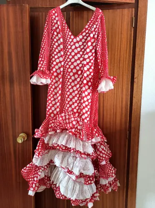 Traje de flamenca con un diseño clásico de lunares. - Mangas abullonadas con volantes de lunares. - Falda con varios volantes. - Enaguas y bolsillo en perfecto estado Corresponde a una talla 38-40 aproximadamente. Las medidas (en plano)son: Pecho: 36 cm Cintura: 34cm Cadera: 40 cm Lo vuelvo a vender porque yo misma lo compré en esta aplicación y no me queda bien de talla. Está nuevo y es de muy buena calidad.