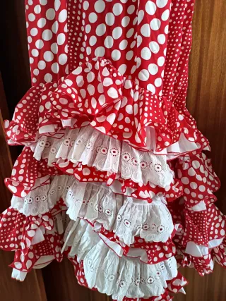 Traje de flamenca con un diseño clásico y alegre. - Vestido blanco con lunares rojos. - Volantes en cascada en la falda. - Mangas acampanadas con volantes. - Adornos de volantes en el escote y la cintura. Talla 6 7 y tiene para sacar de todo lados
