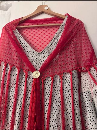 Traje de flamenca con un diseño vibrante y volantes. - Estampado de rosas rojas bordadas y círculos negros sobre fondo blanco. - Mangas con volantes. - Múltiples volantes en la falda. - Chal a juego con flecos rojo. Tiene para sacar, forrado, preguntar sin compromiso.
