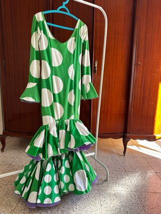 Vestido de flamenca con un diseño alegre y detalles encantadores. - Estampado de pequeños lunares blancos sobre fondo verde. - Mangas largas con volantes y encaje. - Adornos de puntilla y cinta morada en mangas y falda. - Volantes en la parte inferior de la falda.