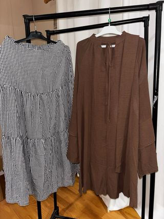 Conjunto de dos piezas. - Falda larga de cuadros blancos y negros. - Blusa marrón de manga larga con cuello - Talla M