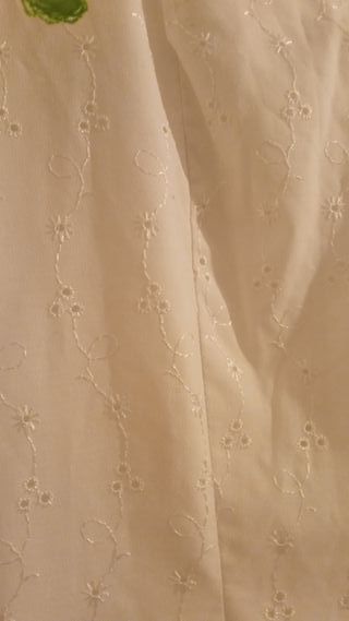 Traje de flamenca blanco con detalles en verde. Medidas: Largo 1'38m Cintura 73cm - Diseño perforado en la tela. - Volantes en mangas y falda. - Ribete verde en los volantes.