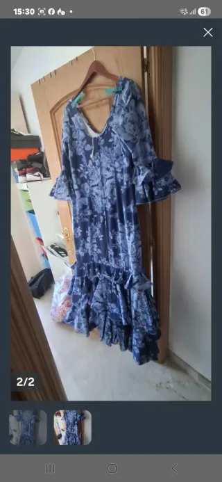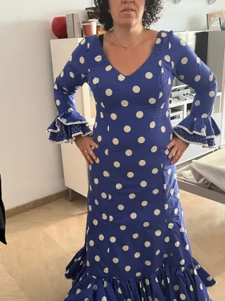 Traje de flamenca con un diseño alegre y llamativo.tiene bolsillo, esta muy bien muy poco usado. Es de Molina - Estampado de lunares blancos sobre fondo azul. - Mangas con volantes. - Falda con múltiples volantes escalonados.