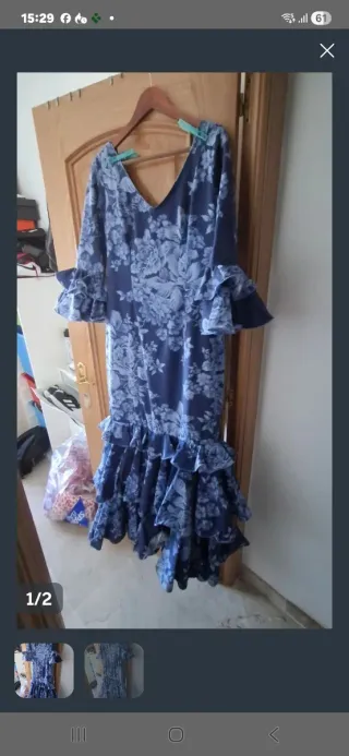 Vestido largo con estampado floral en tonos azules y blancos. Presenta mangas acampanadas y volantes en la falda. Medidas traje flores: largo: 155 Pecho: 110-115 Cintura: 105-110 Caderas: 115-120