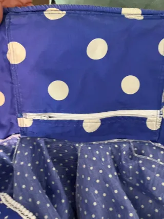 Traje de flamenca con un diseño alegre y llamativo. Talla 36/38 - Estampado de lunares blancos sobre fondo azul. - Volantes en la falda. - Diseño sin mangas.