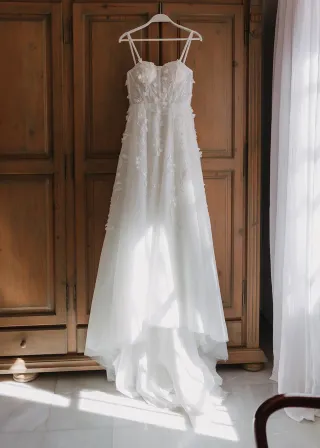 Vestido de novia espectacular , fabricado a medida en Italia. Con un diseño impresionante y detalles delicados hechos a mano. Sin defectos, sin manchas. Como nuevo! - Cuerpo con aplicaciones florales y pedrería. - Falda voluminosa con capas de tul. - Tirantes finos que se pueden quitar. - Mangas separables. Mis medidas: Altura: 164 cm (+ en fotos llevo tacones 8 cm) Pecho: 85cm Cintura: 65 cm Vestido tiene corsé con cinta ajustable a tu medida! Falda con abertura para una pie. La longitud de la falda desde corsé a suelo: 108 cm La longitud de la cola detrás (160 cm) Después de limpieza pro en tintorería. Precio original 1899€