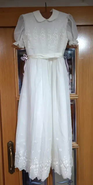 Traje de comunión de color blanco, ideal para ceremonias. - Diseño elegante con detalles de encaje. - Mangas cortas abullonadas. - Cinturón de tela a juego. - Falda larga con bordados en el bajo.
