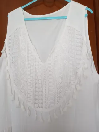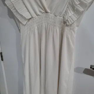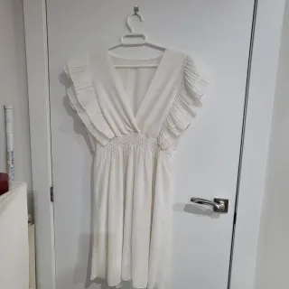 Vestido blanco con detalles de volantes en las mangas y cintura elástica. - Escote en V. - Mangas cortas con volantes. - Cintura fruncida. - Falda con caída. - Tejido ligero. Se recoge en benimaclet Si compráis más cosas hago precio