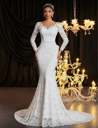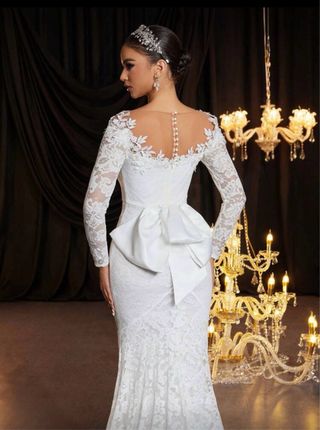Elegante vestido de novia con un delicado encaje floral. Glamrae Elegante y romántico vestido de novia de encaje floral transparente con mangas largas, cuello alto, bordado 3D, ajuste ceñido de cintura alta, cola de sirens con falda larga desmontable y gran lazo, vestido de novia blanco Precioso 💕 Envios disponibles