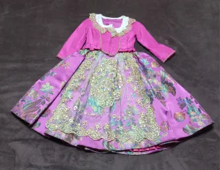 Traje de Fallera con un diseño elegante y detallado. - Tejido principal con estampado floral en tonos rosas y plateados. - Delicado encaje blanco en cuello, mangas y falda. - Adornos dorados bordados en la falda. - Mangas acampanadas con volantes de encaje. -mide 100 cm NO SE ENVÍA