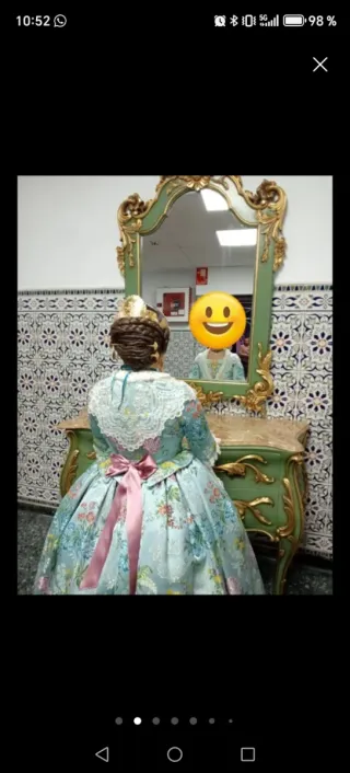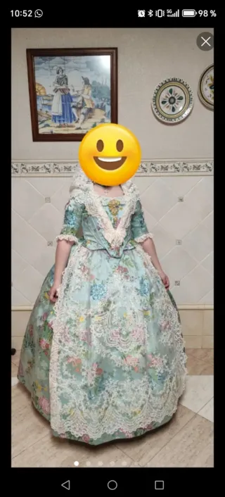 Traje de época inspirado en el siglo XVIII, con un diseño intrincado y detallado. Talla 9-10 años, mirad medidas Se incluyen manteletas y zapatos talla 34 - Diseño con bordados florales. - Mangas largas. - Adornado con encaje blanco. Medidas corpiño Sisa 32 Hombro a hombro 28 Manga 31 Medidas falda Cintura de 25 a 31 Largo 87 #fallera #trajeregional #vestido