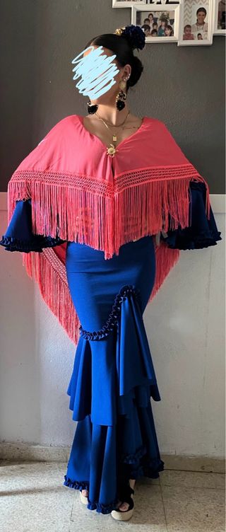 Precioso vestido de gitana, ideal para cualquier feria o evento especial. Está en muy buen estado y listo para lucirlo. - Diseño de falda con volantes. - Manga larga con volantes. - Color turquesa y detalles rosas - El mantincullo de flecos se puede quitar y poner - El vestido tiene posibilidad de sacarle de ancho