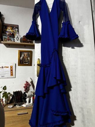 Vestido de gitana con poco uso, elegante y cómodo. - Diseño con volantes en la falda. - Mangas acampanadas. - Adorno bordado en el escote. - Detalle de flecos.