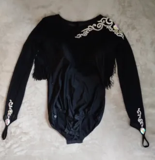 Vestido de competición de baile deportivo con detalles brillantes y flecos. - Talla 36 - 55 kg aprox - altura 1,67 - Dos piezas: maillot y falda. - Automáticos para unir la falda al maillot. - Diseño de manga larga. - Adornos de pedrería en el hombro y puños. - Flecos (doble fila) en la zona del pecho con cazuelas de sujección interior. - Detalles de pedrería en forma de lágrima en los puños. - Puesto dos veces.