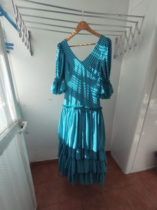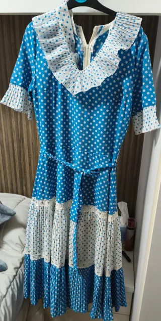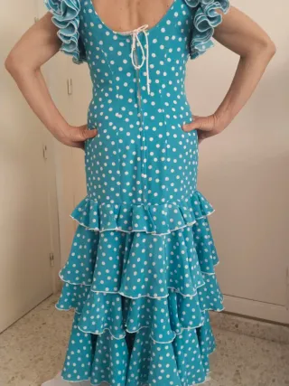 Vestido de flamenca con un diseño de lunares usado un par de veces está nuevo - Color azul claro con lunares beig - Mangas largas con volantes. - Múltiples volantes en la falda.