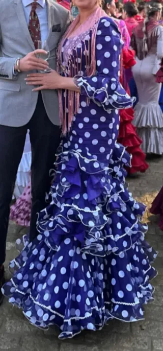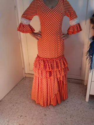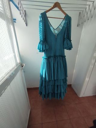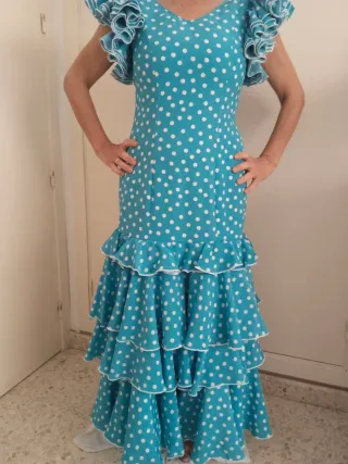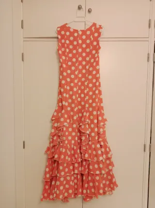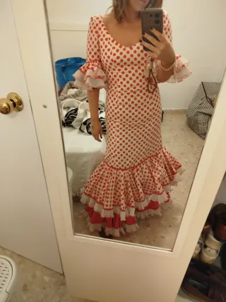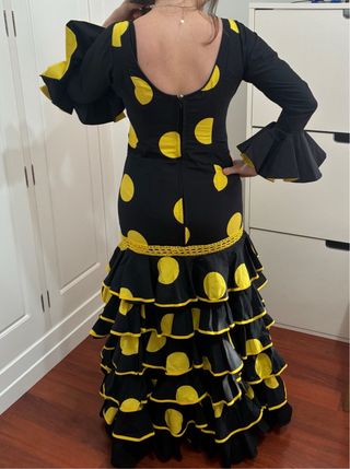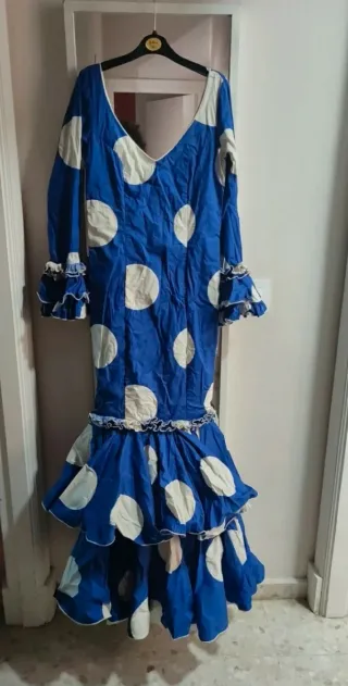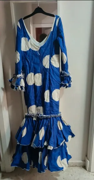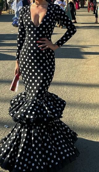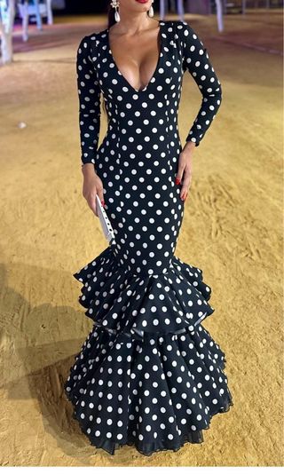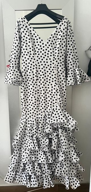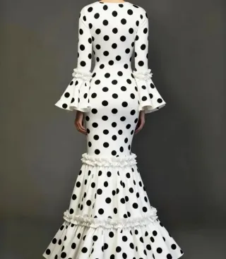 Elegante traje de flamenca con un diseño único. Traje de flamenca a medida.Tiene un año. Puesto dos veces. Talla 38 pero tiene para sacarle una talla y media más. Largo del vestido 149 - Cuerpo de manga larga con estampado de lunares. - Espalda abierta con detalle. - Falda con volantes estilo sirena.