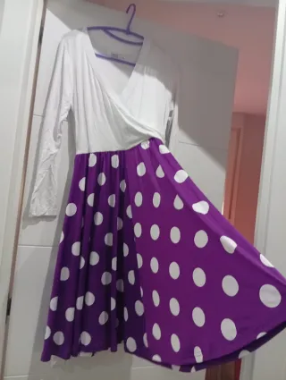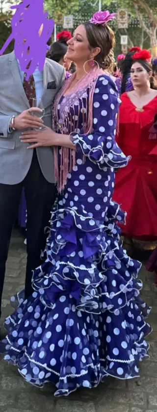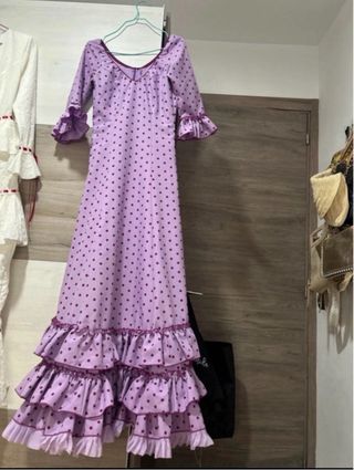 Preciosa bata rociera de color morado con lunares. - Diseño con volantes en la falda. - Escote adornado con tiene el diseño de garrucha abajo (se le puede quitar) es cómodo tiene para sacarle y meter TALLA S Ancho de pecho: 38 cm Ancho de cintura: 34 cm Ancho de cadera: 39 cm Largo manga: 40 cm Largo total: 145cm