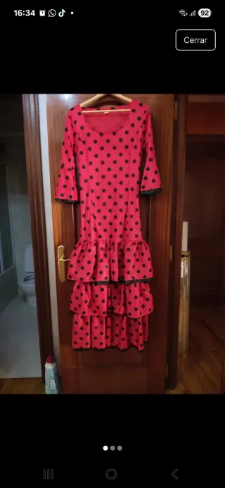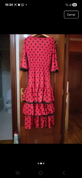 Traje de flamenca con un diseño clásico y elegante. Medidas 96 de pecho,86 cintura,104 cadera,altura mia 164 - Color rojo vibrante con estampado de lunares negros. - Mangas acampanadas con volantes. - Falda con varios volantes y detalles en negro.