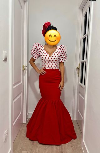 Vestido de flamenca con un diseño vibrante y elegante. - Cuerpo blanco con lunares rojos. - Mangas abullonadas. - Falda larga roja con volantes.